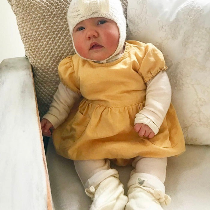 Designed not to fall off, these double layered organic merino booties will keep baby's feet warm and toasty. The booties can be folded up for more protection or folded down for a casual look.